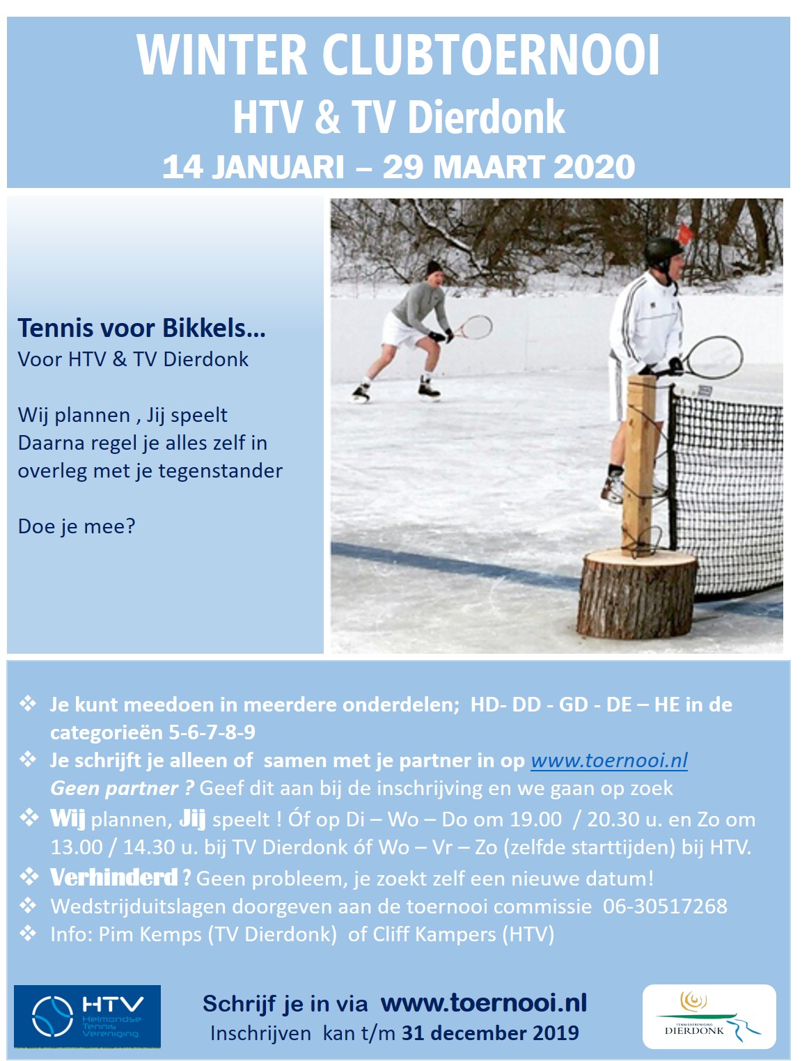 Het is tennis voor de echte bikkels, voor iedereen die uit zijn luie stoel wil komen en in weer en wind op de tennisbaan wil staan. Het is winterpret voor tennissers vanaf 14 jaar! Er wordt op verschillende avonden en op zondagmiddag in de maanden januari, februari en maart gespeeld. Het is mogelijk om in te schrijven in dubbels, mixen en singels. De toernooicommissie maakt van te voren een indeling, maar verder is het vrijheid blijheid.